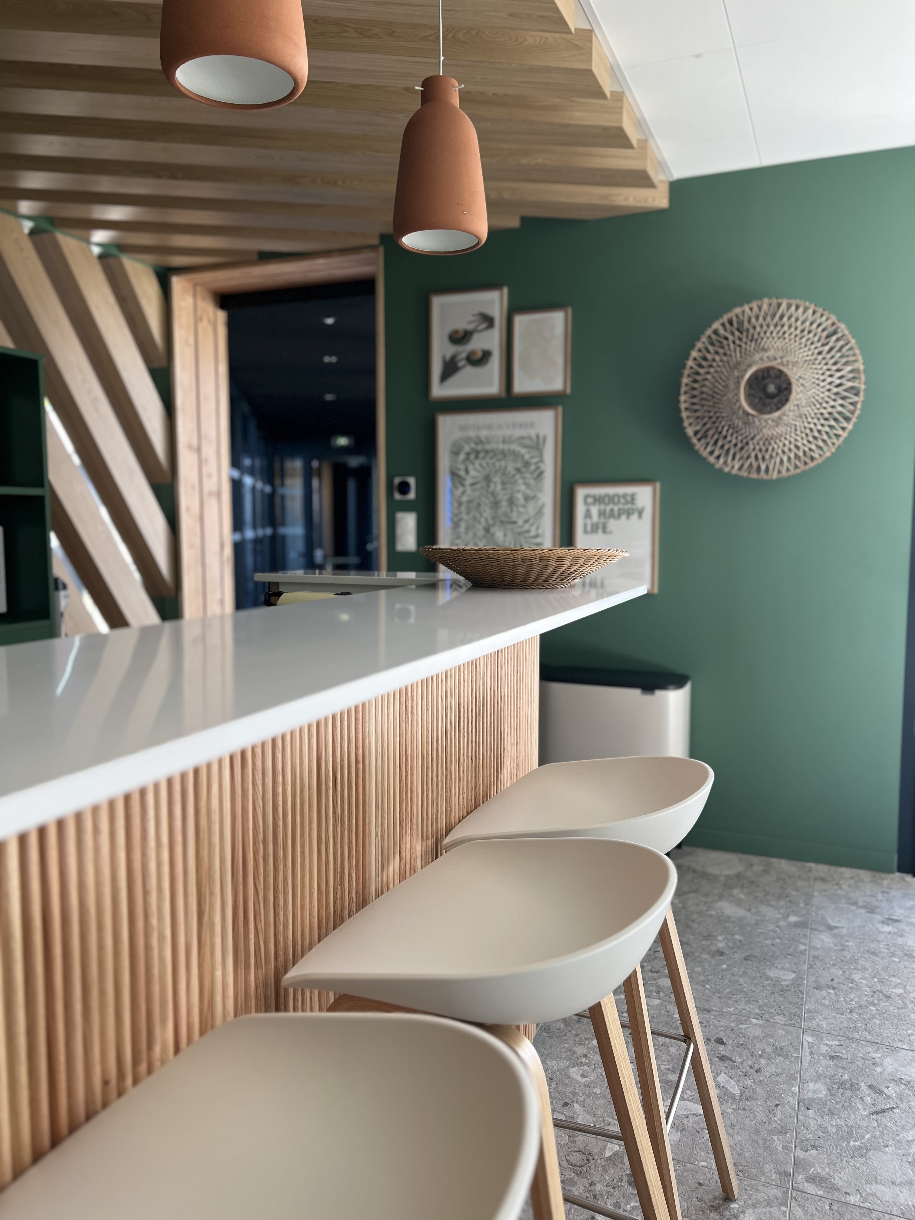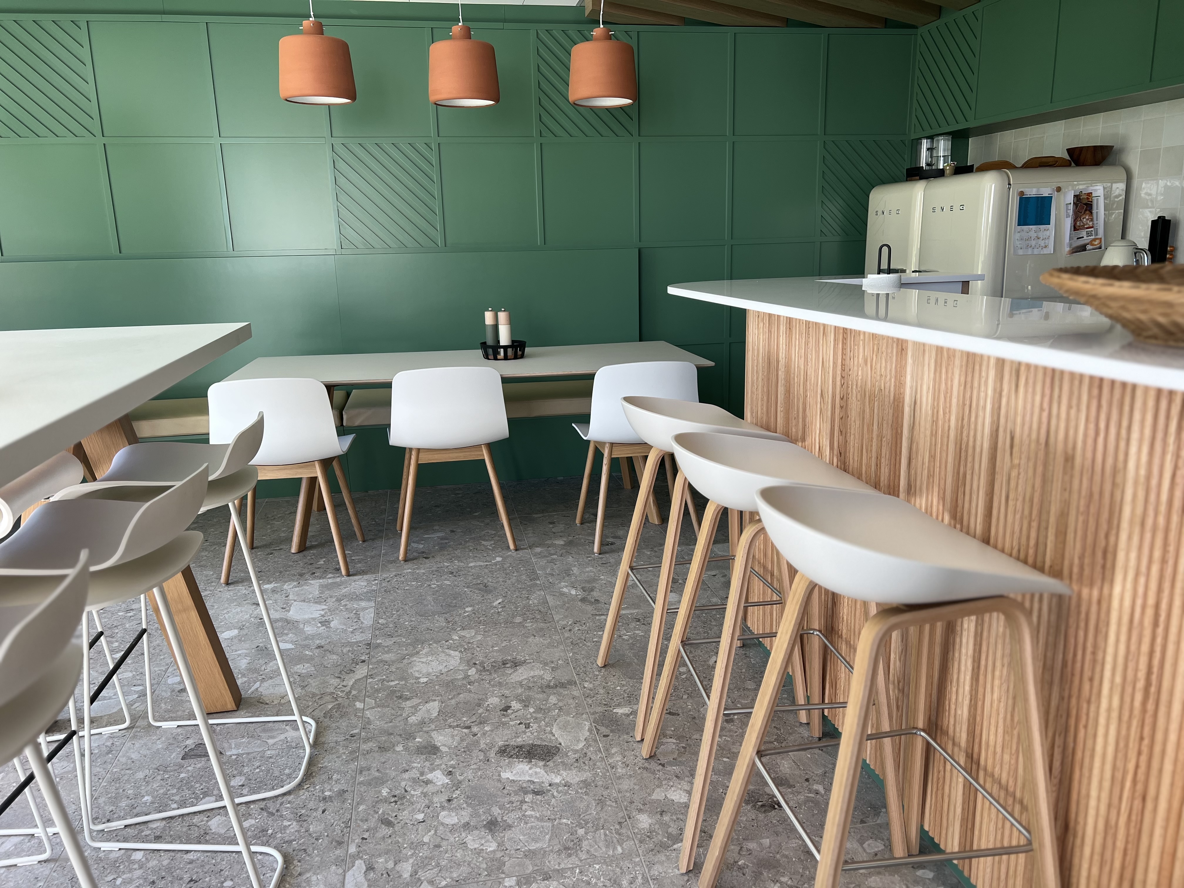 Cette continuité de matériaux et de teinte crée une cohérence visuelle et renforce l’unité architecturale du site. Les ouvertures sont réalisées en aluminium laqué gris anthracite, en harmonie avec celles du bâtiment existant.