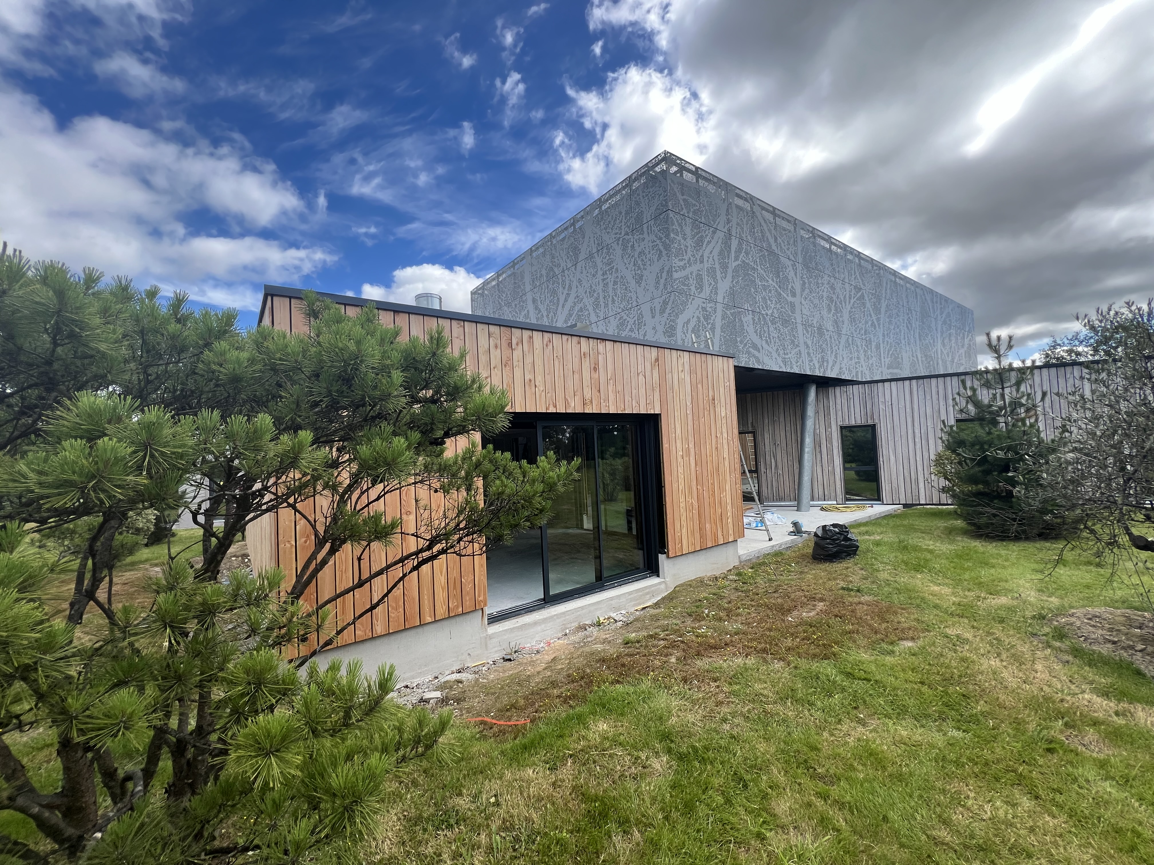 Ce choix chromatique souligne la sobriété contemporaine de l’ensemble et met en valeur la texture chaleureuse du bois. L’ensemble de la toiture est réalisée en bacs aciers recouverts d’une étanchéité, et reste invisible depuis la voie publique, garantissant la pureté des lignes architecturales.