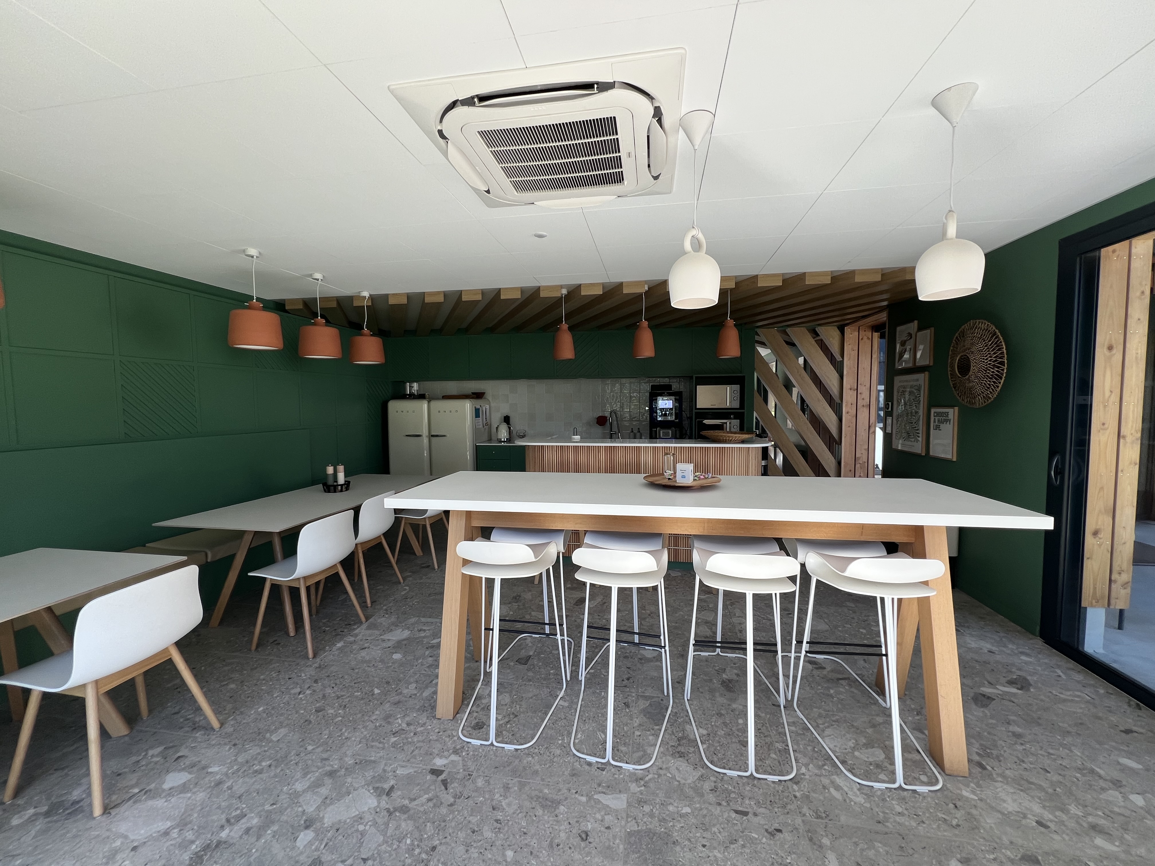 Il permet également d’accéder à une terrasse extérieure couverte, située sous le volume en R+1. Cette terrasse couverte offre un espace de détente lumineux et abrité, directement accessible depuis la salle de pause, favorisant ainsi les échanges et la convivialité au sein du site. Le volume rectangulaire est habillé d’un bardage bois douglas à lames verticales, identique à celui du bâtiment situé en vis-à-vis.