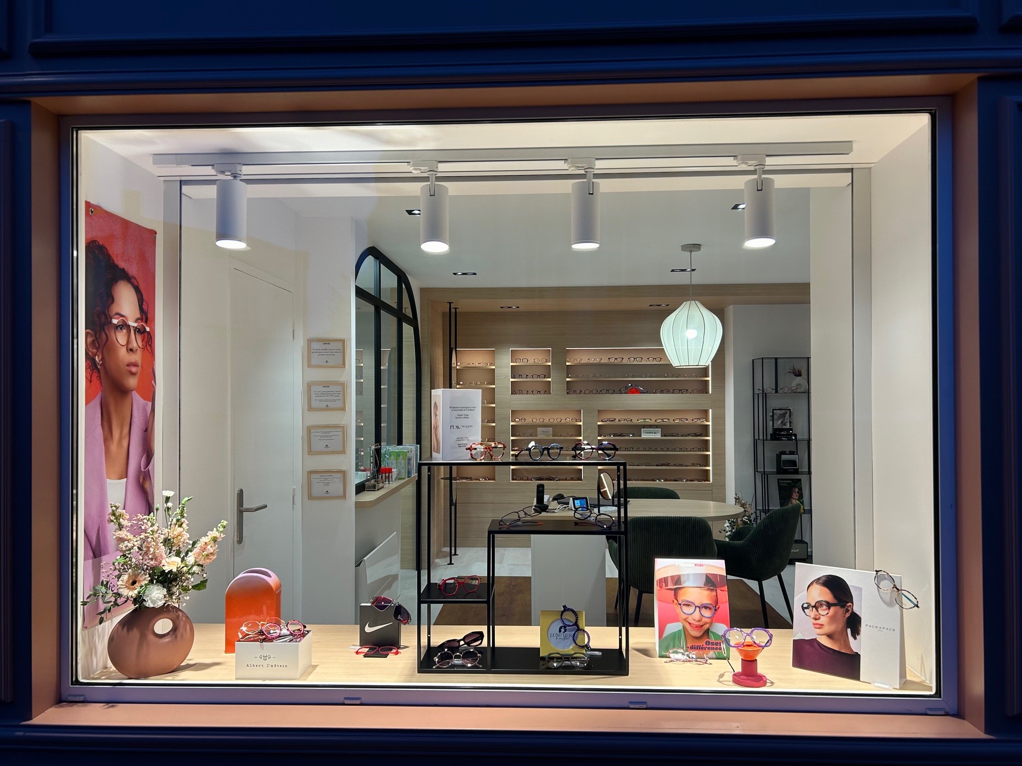 Après 1 mois de travaux, la boutique les Lunetiers de Mouilleron ouvre ses portes. Un concept crée par l’agence Brisson. Toute la boutique s’agence autour du meuble principal qui se déploie sur toute la largeur de la boutique. Un poteau structurel blanc sépare le côté féminin et masculin. Les deux côtés étant reliés visuellement par le plafonnier en chêne. Les montures sont mises en avant par du rétroéclairage leds. Le sol, pour plus de luminosité, est paré d’un revêtement pvc imitation pierre. On trouve deux tapis de démarcation couleur rouille pour délimiter les deux espaces de réception. La couleur terra cotta est le fil conducteur du concept, elle apporte de la douceur à l’ambiance. On la trouve, pour plus de profondeur, dans les fonds de niches ou encore sur les murs. La façade qui se démarque avec sa couleur terra cotta est comme un bonbon, elle donne le ton de l’intérieur et attire l’œil du passant. C’est un univers moderne, chaleureux et féminin que l’on prend plaisir à vous faire découvrir.