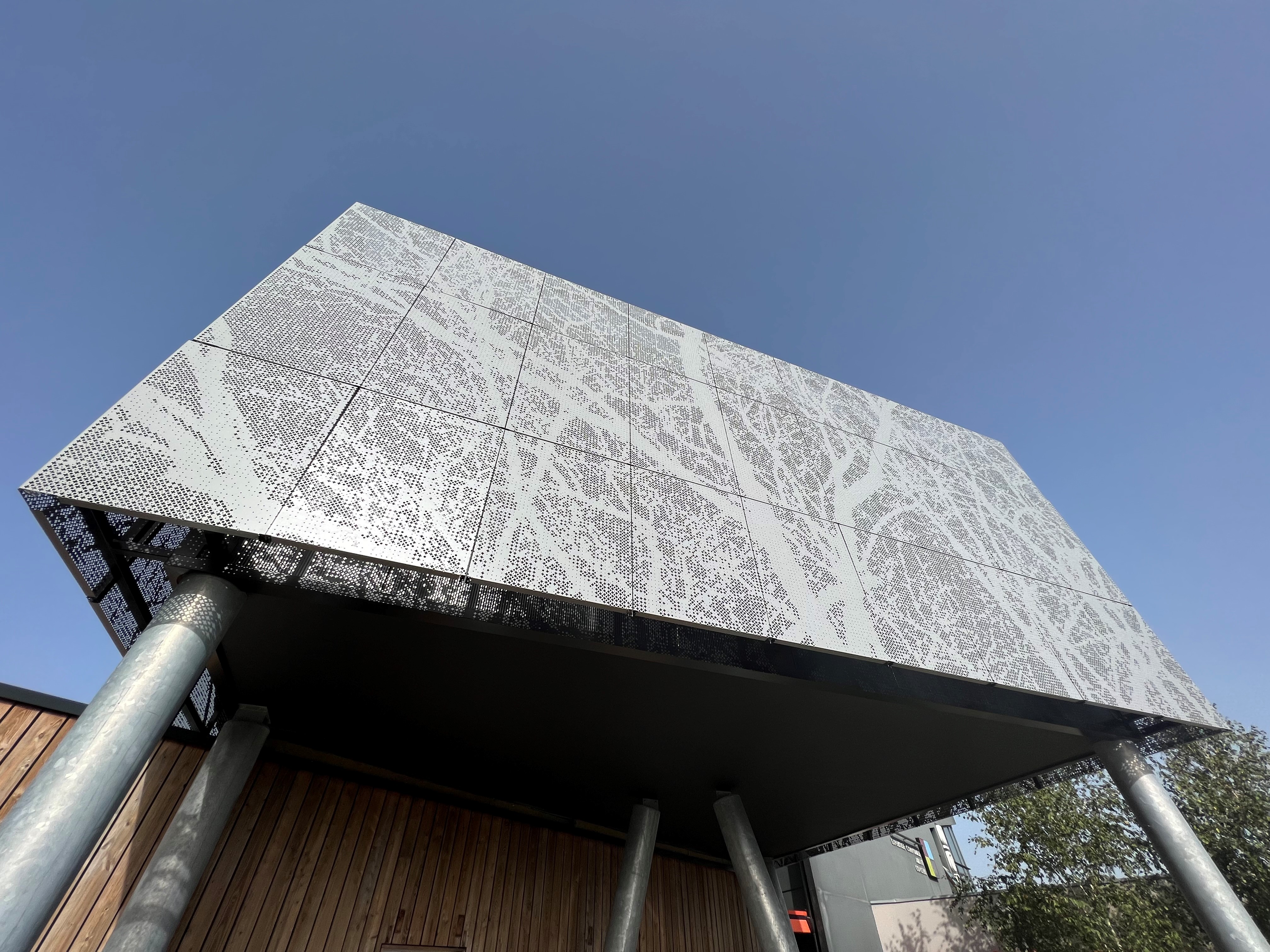 Les façades sont recouvertes d’une résille métallique perforée décorative découpée au laser. La résille métallique joue un double rôle :